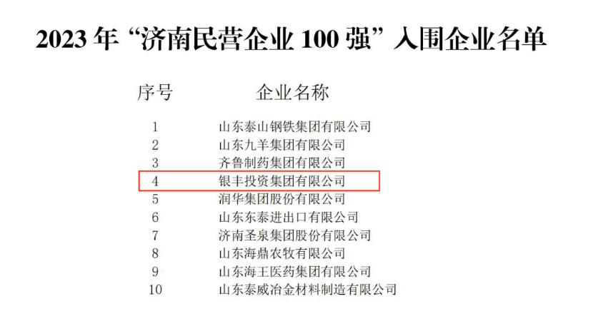 Recently, Jinan Private Economic Development Bureau official website announced 2023 "Jinan private enterprise 100", in the announcement of the Jinan private enterprise 100 Yinfeng Investment Group jumped to the fourth list of the top 100.